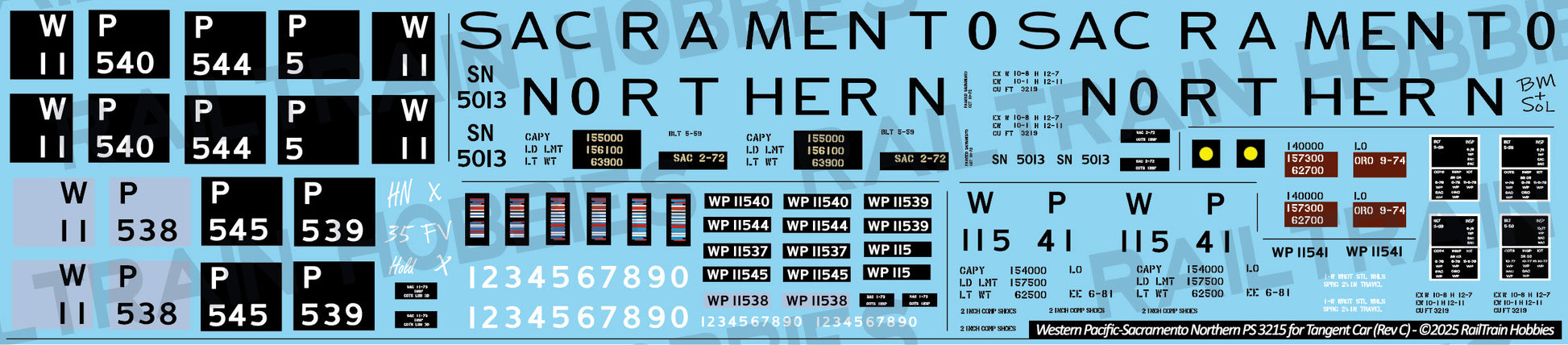 This set is designed for the Tangent PS 3219 Covered Hopper. It started out as a patch set, but was expanded to include full lettering for alternate schemes on these cars. You can use it to patch the existing Tangent factory-lettered Sacramento Northern car for WP (as done by the WP car shops in the late 1970s), or fully letter a model in one of the alternate paint schemes found on these cars. The set includes numerous ready-to-apply patch numbers, plus patch "blanks" you can use to number any car number. It also includes full lettering you can use to create an alternate Sacramento Northern repaint on car SN 5013 (check out those zeros used as Os as done by WP's car shop!) and full lettering for a simplified WP repaint scheme as seen on at least one car, WP 11541.